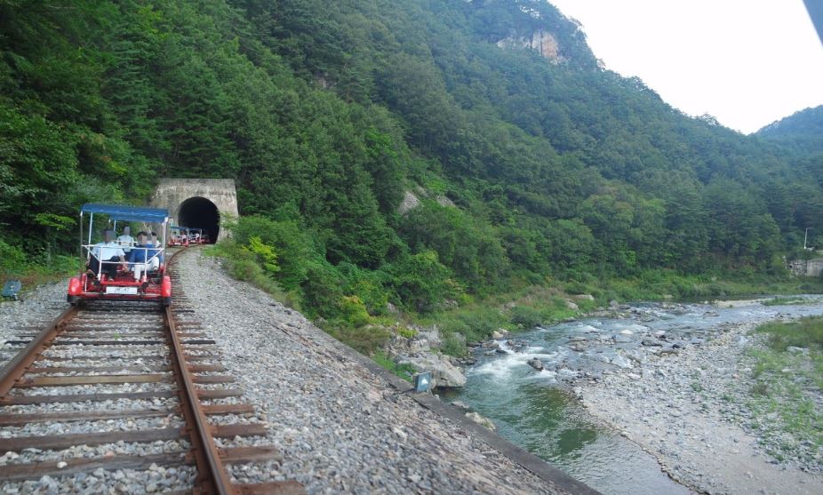 - 정선 레일바이크 탑승 – 7~8km 구간을 자전거처럼 페달을 밟으며 자연을 즐기는 체험