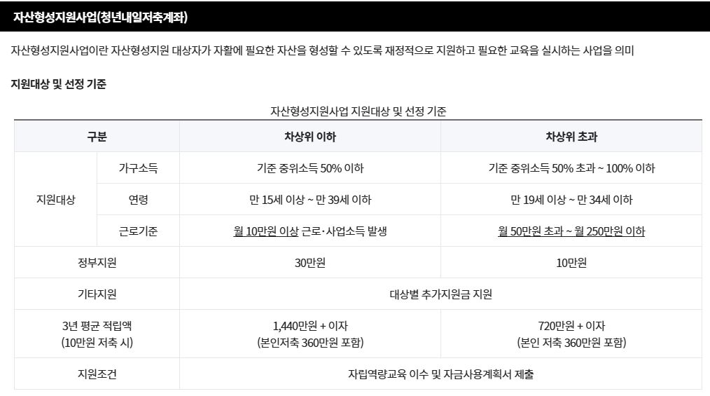 | 청년내일저축계좌 | 월 10만 원 | 월 10~30만 원 | 최대 2,160만 원 |