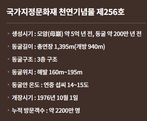 관광객이 탐방할 수 있는 구간은 약 1.8km로, 조명과 안전시설이 잘 갖추어져 있어 어린이부터 어르신까지 모두가 안전하게 관람할 수 있습니다. 지질학적 가치와 신비로운 자연 경관이 어우러져 학습형 생태관광지로도 손색이 없습니다.